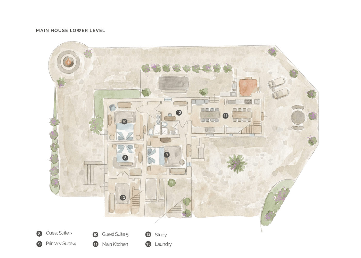 Outdoors, a wisteria-covered terrace extends the house with an open-air kitchen and professional gas grill. A stone fire pit gathers evenings beneath the Tuscan sky. High-speed WiFi, Sonos sound, smart televisions, and climate control are seamlessly integrated. Plush towels, cotton robes, hypoallergenic mattresses, and Grown Alchemist amenities provide refined comfort and rest. The Main House is not pet-friendly.