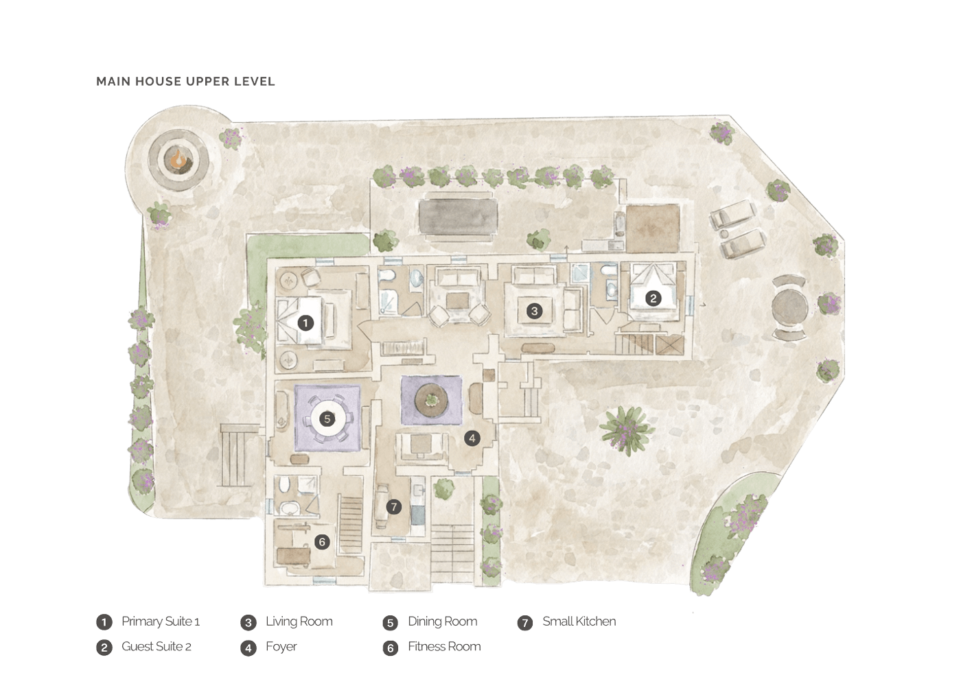 - Guest Suite #5: King size bed with private terrace, en-suite bathroom with double vanity, and shower. Adjacent study room with printer and iPad.